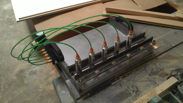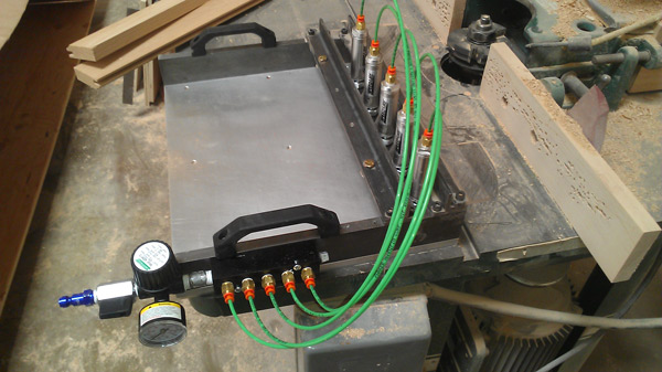 Custom coping sled designed and built recently. Simple design using standard raw materials and took it to a machine shop who fabricated the parts and assembled it. A few more of the components were added at the end and it functions as designed. It allows our shop to cut or route the end pieces of wood rail parts for the doors 4 to 5 at a time whereas before we could only do one at a time and with the quick release of the air pressure.